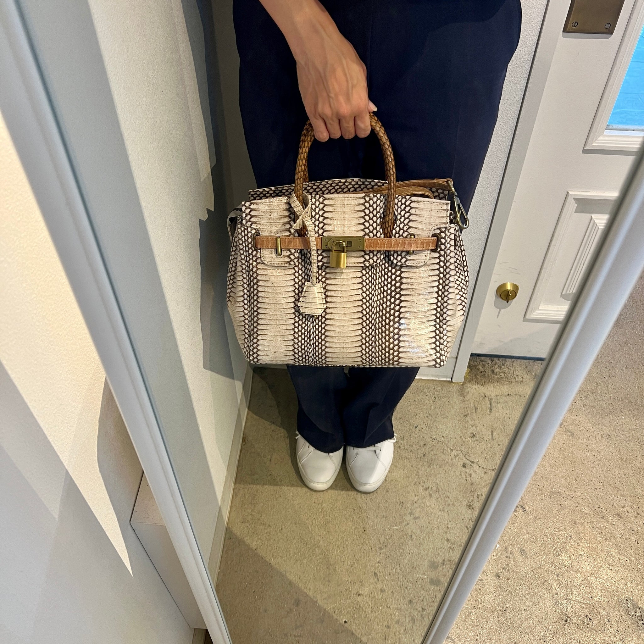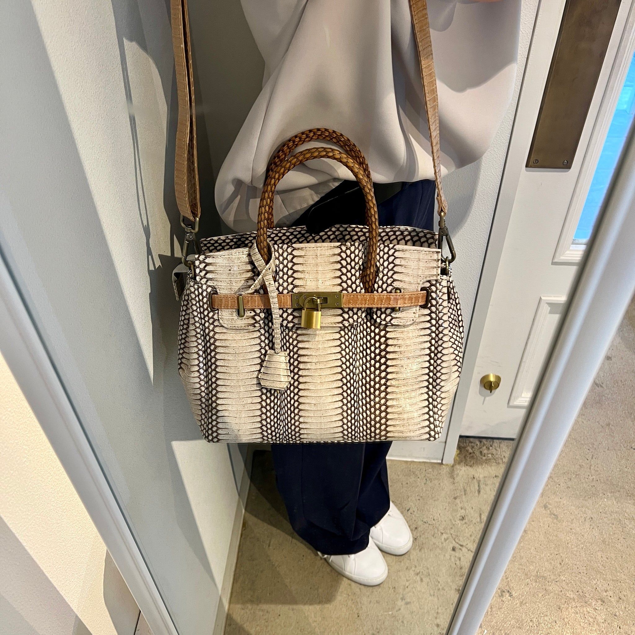 pliable定番の鍵付きバッグの中サイズです。中に取り外し可能なショルダーベルトがあるので、手持ちでも肩掛けにしても持っていただけます。長財布や500mlのペットボトルが入るサイズ感で、普段使いにぴったりですよ。 ※天然素材の為、色味や柄の出方に画像と差異が出ますが、個性としてお楽しみ下さい。※財布など小物は別売りです。