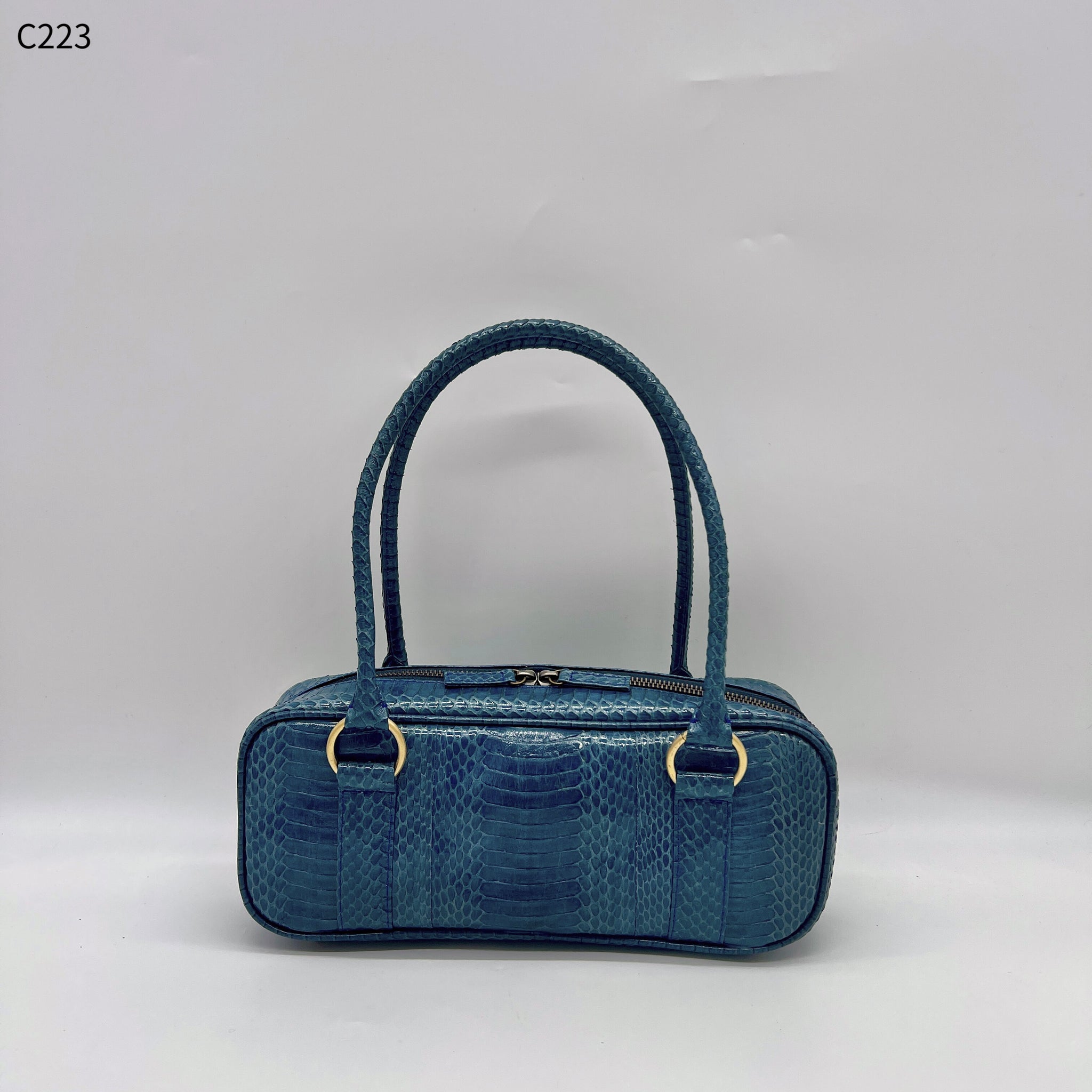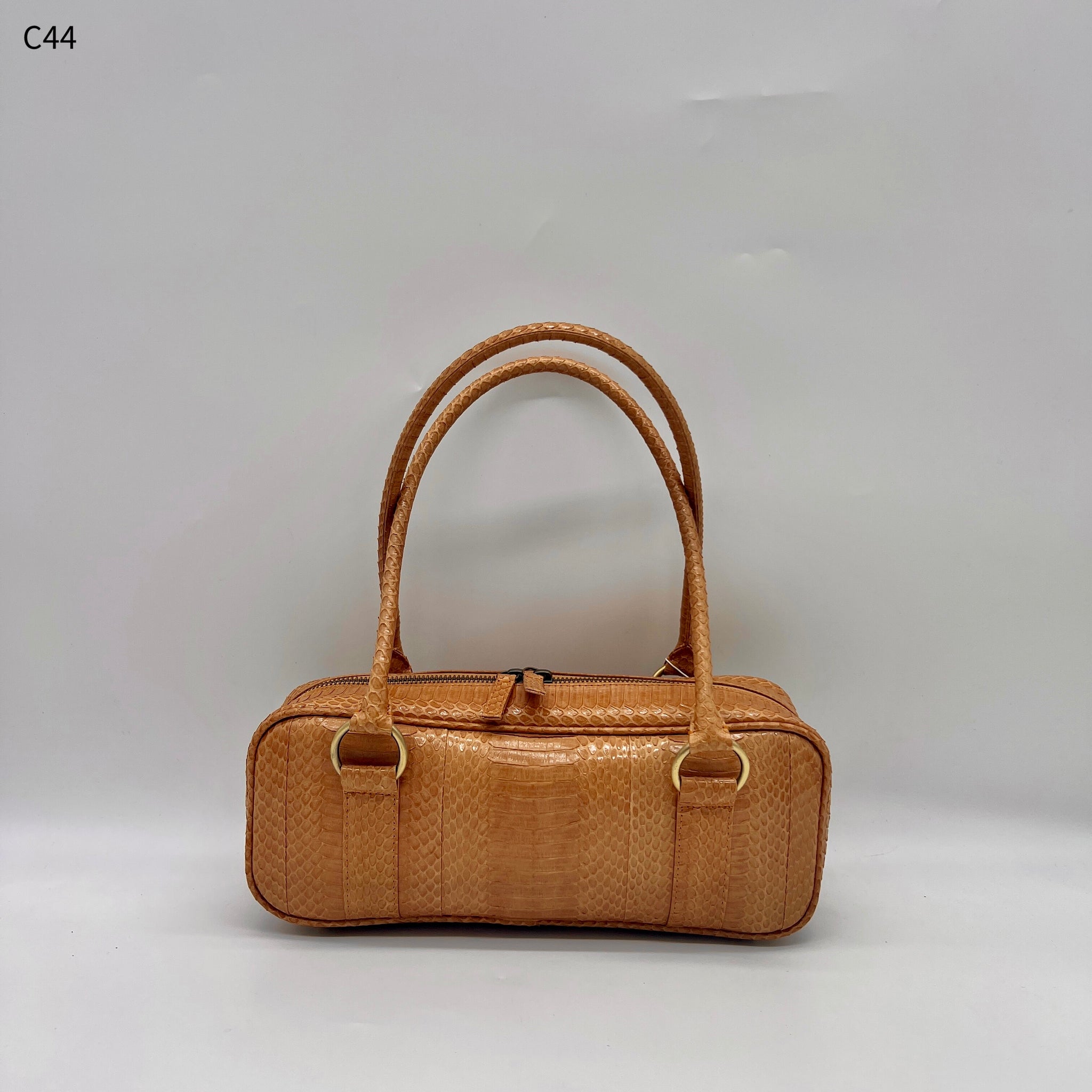 細長いフォルムが特徴的なハンドバッグです。持ち手の長さも程よく、肩掛けでも手持ちでも使って頂けます。長財布や500miのペットボトルが横に入るサイズ感なので、見た目よりも使いやすいですよ。※天然素材の為、色味や柄の出方に画像と差異が出ますが、個性としてお楽しみ下さい。※財布など小物は別売りです。