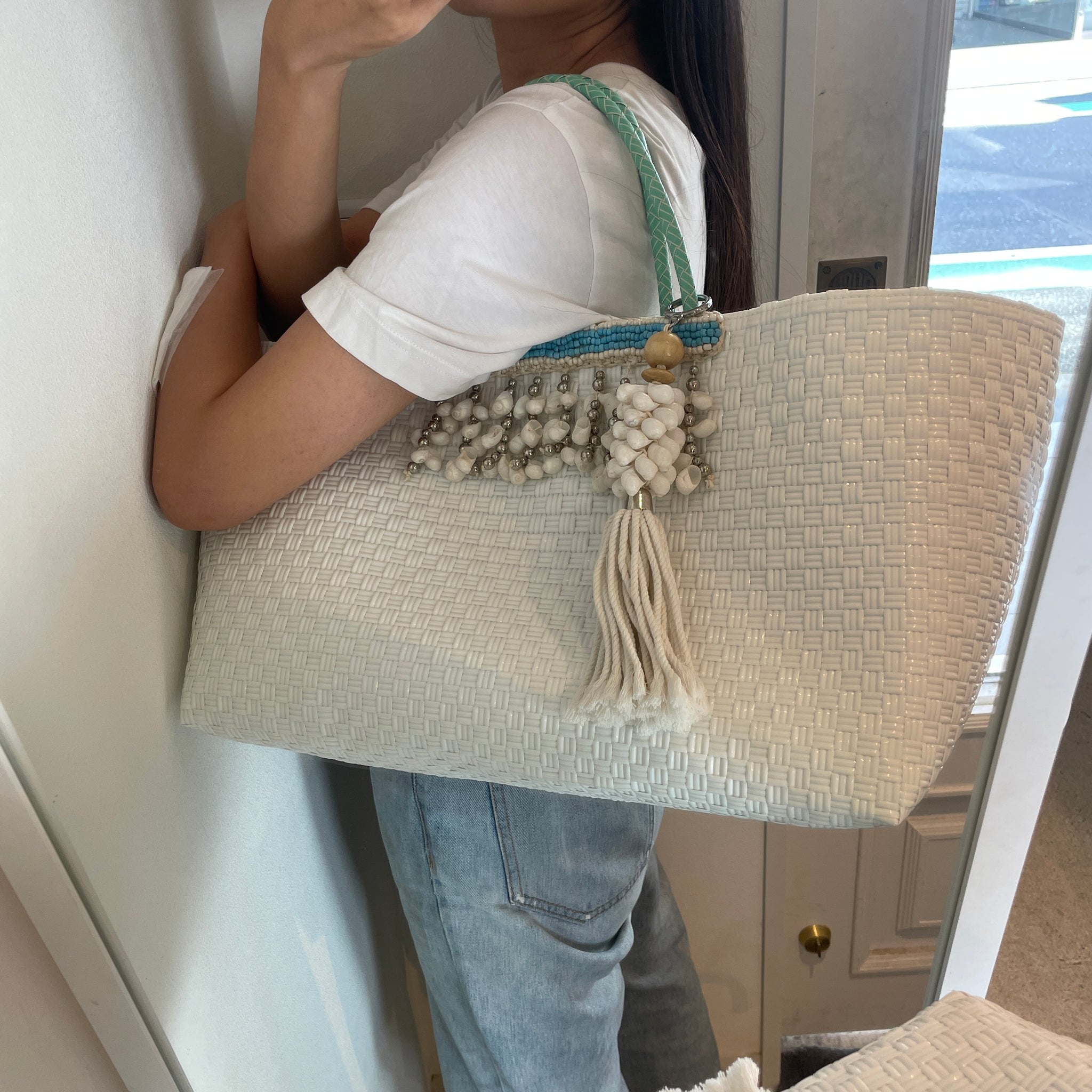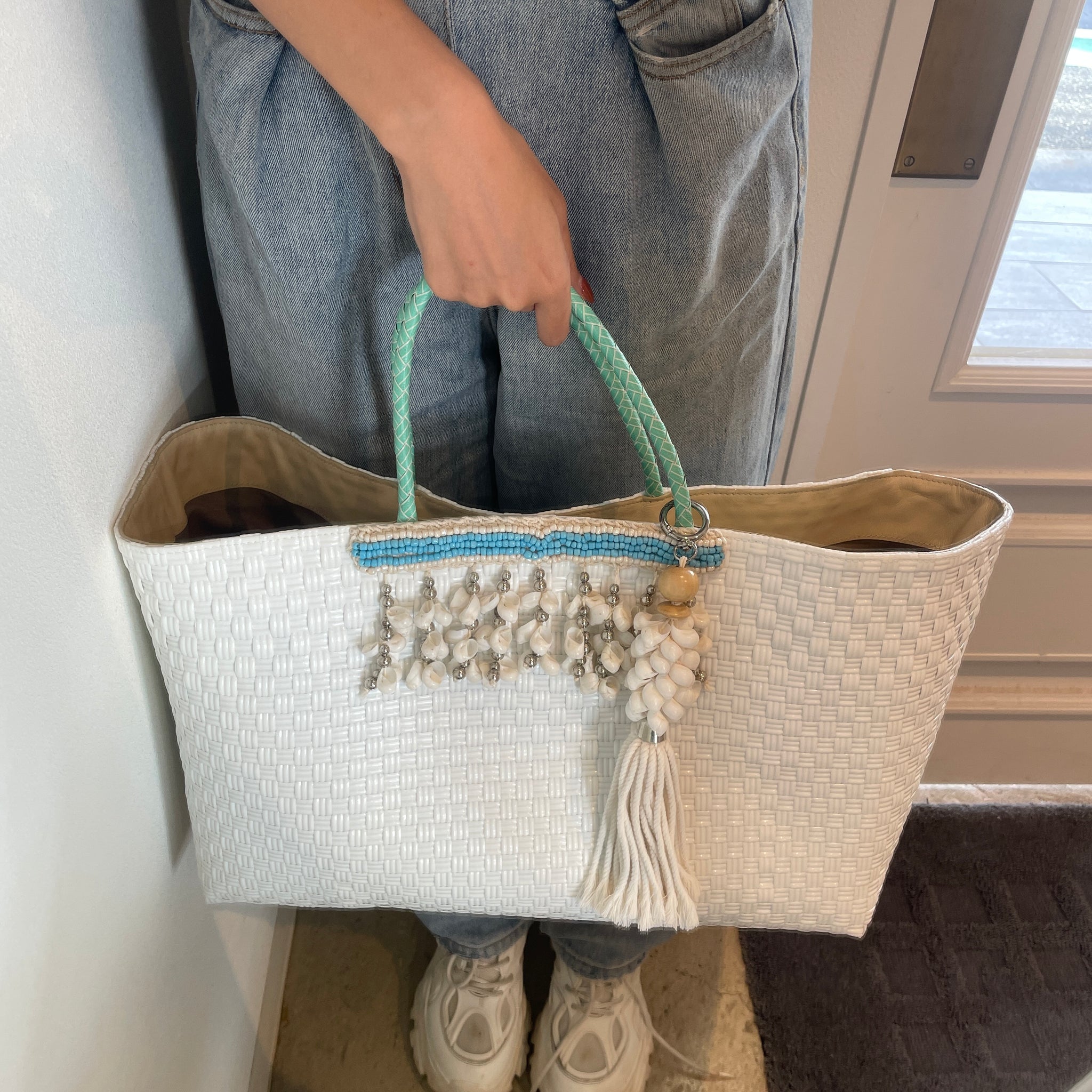 軽くて丈夫なカゴバッグは、良質なインドネシアジャワ島のものを使用。フロント部分は天然の貝で贅沢に装飾されています。裏地部分には内ポケットもあるので使いやすさも抜群です。キーホルダーは取り外し可能なので、お手持ちのバッグに付けても可愛いですね。※天然素材は、色味や柄の出方に画像と差異が出ますが、個性としてお楽しみ下さい。※財布など小物は別売りです。